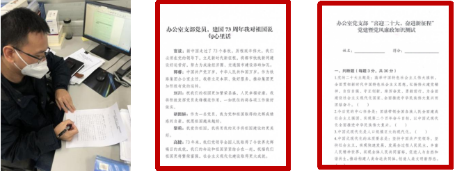 活動簡介:為與時俱進(jìn)深入學(xué)習(xí)貫徹黨的二十大精神,用黨的創(chuàng)新理論武裝黨員干部頭腦、指導(dǎo)工作實(shí)踐,10月24日,辦公室黨支部開展了“學(xué)習(xí)貫徹黨的二十大精神,推動辦公室工作創(chuàng)一流業(yè)績”主題黨日活動?;顒又?,再次學(xué)習(xí)了黨的二十大報告、習(xí)近平總書記近期重要講話精神,討論了黨費(fèi)收繳、意識形態(tài)工作、廉政建設(shè)、入黨積極分子培訓(xùn)等事項,開展了“建國73周年,我對祖國說句心里話”活動和“喜迎二十大,奮進(jìn)新征程”黨建暨黨風(fēng)廉政建設(shè)知識測試。
