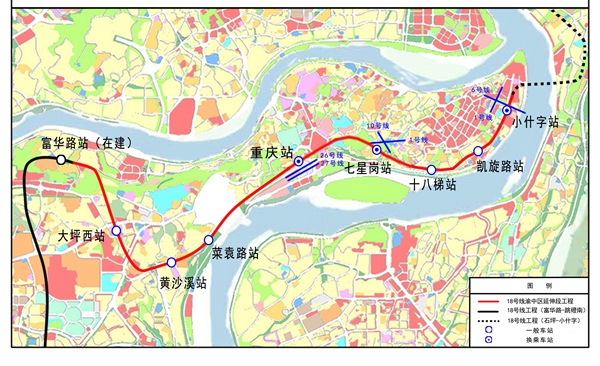 18號(hào)線(xiàn)北延伸段(富華路~小什字)全長(zhǎng)11公里,投資100億元,設(shè)大坪西站、黃沙溪站、菜袁路站、重慶站、七星崗站、十八梯站、凱旋路站、小什字站共8座車(chē)站。18號(hào)線(xiàn)為重慶市軌道交通線(xiàn)網(wǎng)中的西南-東北向的骨干線(xiàn)路,強(qiáng)化了城市核心區(qū)的快速聯(lián)系。18號(hào)線(xiàn)北延伸段為中心城區(qū)加密線(xiàn),與18號(hào)線(xiàn)相接,有效緩解化龍橋、大坪、菜園壩等片區(qū)交通擁堵,填補(bǔ)了渝中半島下半城的軌道空白。