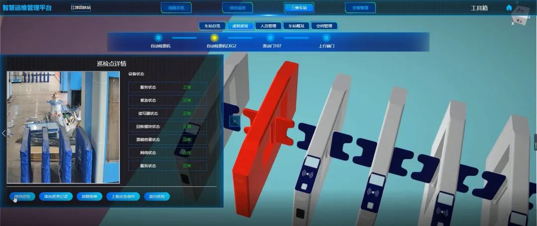 傳統(tǒng)軌道交通車(chē)站開(kāi)站及關(guān)站過(guò)程復(fù)雜,涉及設(shè)備繁多,且絕大部分設(shè)備需要人工啟停,導(dǎo)致開(kāi)關(guān)站耗時(shí)較長(zhǎng),而江跳線將一鍵開(kāi)關(guān)站功能應(yīng)用到全線車(chē)站。該功能結(jié)合運(yùn)營(yíng)實(shí)際需求優(yōu)化了開(kāi)關(guān)站流程和聯(lián)動(dòng)項(xiàng)目,通過(guò)對(duì)CCTV實(shí)時(shí)畫(huà)面、廣播語(yǔ)音播報(bào)、電扶梯、卷簾門(mén)等相關(guān)專(zhuān)業(yè)設(shè)備的聯(lián)控,科技賦能提高客運(yùn)人員開(kāi)關(guān)站效率,為實(shí)現(xiàn)江跳線智能化管理和智慧化運(yùn)營(yíng)邁進(jìn)重要的一步。